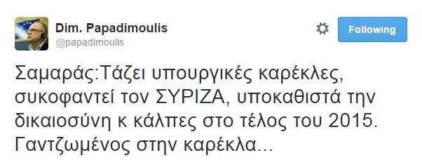 Σαμαράς: Τάζει υπουργικές καρέκλες, συκοφαντεί τον ΣΥΡΙΖΑ, υποκαθιστά την δικαιοσύνη και κάλπες στο τέλος του 2015. Γαντζωμένος στην καρέκλα…” έγραψε στο λογαριασμό του στο twitter ο αντιπρόεδρος του Ευρωπαϊκού Κοινοβουλίου, Δημήτρης Παπαδημούλης σχολιάζοντας το διάγγελμα του Πρωθυπουργού.
