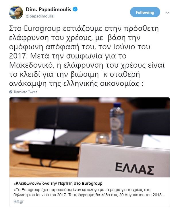“Στο Eurogroup εστιάζουμε στην πρόσθετη ελάφρυνση του χρέους, με βάση την ομόφωνη απόφασή του, τον Ιούνιο του 2017. Μετά την συμφωνία για το Μακεδονικό, η ελάφρυνση του χρέους είναι το κλειδί για την βιώσιμη και σταθερή ανάκαμψη της ελληνικής οικονομίας” γράφει ο κ. Παπαδημούλης στην ανάρτηση του.