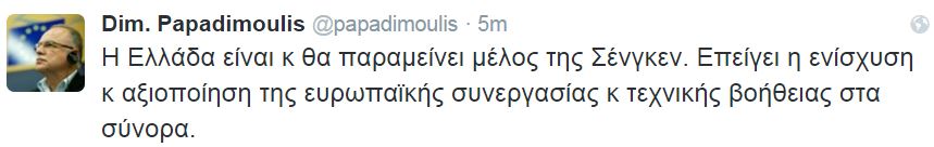 «Η Ελλάδα είναι κ θα παραμείνει μέλος της Σένγκεν Επείγει η ενίσχυση κ αξιοποίηση της ευρωπαϊκής συνεργασίας κ τεχνικής βοήθειας στα σύνορα» έγραψε στον προσωπικό του λογαριασμό στο twitter ο κ. Παπαδημούλης.