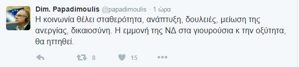 «Η κοινωνία θέλει σταθερότητα, ανάπτυξη, δουλειές, μείωση της ανεργίας, δικαιοσύνη», γράφει στο Twitter, ο ευρωβουλευτής του ΣΥΡΙΖΑ και αντιπρόεδρος του ευρωπαϊκού κοινοβουλίου, Δημήτρης Παπαδημούλης.