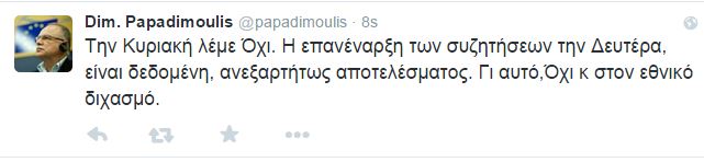 «Την Κυριακή λέμε Όχι. Η επανέναρξη των συζητήσεων την Δευτέρα, είναι δεδομένη, ανεξαρτήτως αποτελέσματος. Γι αυτό, Όχι κ στον εθνικό διχασμό», έγραψε χαρακτηριστικά στον προσωπικό του λογαριασμό στο twitter ο εν των αντιπροέδρων του ευρωπαϊκού Κοινοβουλίου.