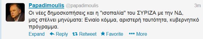 “Ενιαίο κόμμα, αριστερή ταυτότητα, κυβερνητικό πρόγραμμα”, σχολιάζει στο twitter ο Δημήτρης Παπαδημούλης με αφορμή τις σημερινές δημοσκοπήσεις.