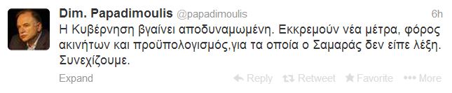 «Η κυβέρνηση βγαίνει αποδυναμωμένη. Εκκρεμούν νέα μέτρα, φόρος ακινήτων και προϋπολογισμός, για τα οποία ο Σαμαράς δεν είπε λέξη. Συνεχίζουμε», έγραψε χαρακτηριστικά στον προσωπικό του λογαριασμό στο twitter, ο Δημήτρης Παπαδημούλης.