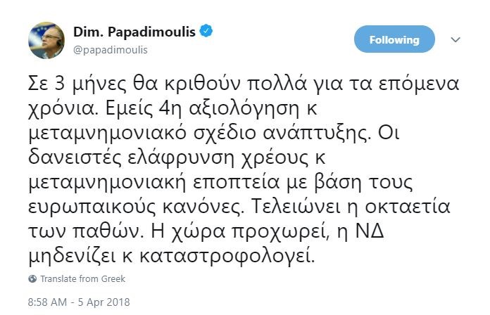 “Σε τρεις μήνες θα κριθούν πολλά για τα επόμενα χρόνια. Εμείς τέταρτη αξιολόγηση και μεταμνημονιακό σχέδιο ανάπτυξης. Οι δανειστές ελάφρυνση χρέους και μεταμνημονιακή εποπτεία με βάση τους ευρωπαϊκούς κανόνες. Τελειώνει η οκταετία των παθών. Η χώρα προχωρεί, η ΝΔ μηδενίζει και καταστροφολογεί” έγραψε σε ανάρτηση του ο κ.Παπαδημούλης στον προσωπικό του λογαριασμό στο Twitter.