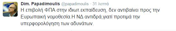 Μέσω του λογαριασμού του στο twitter, σχολίασε ο ευρωβουλευτής του ΣΥΡΙΖΑ, Δημήτρης Παπαδημούλης, την επιβολή ΦΠΑ 23% στην ιδιωτική εκπαίδευση, σημειώνοντας οτι “δεν αντιβαίνει προς την ευρωπαϊκή νομοθεσία” :