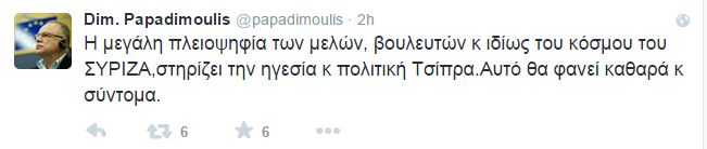 «Η μεγάλη πλειοψηφία των μελών, βουλευτών και ιδίως του κόσμου του ΣΥΡΙΖΑ, στηρίζει την ηγεσία και πολιτική Τσίπρα. Αυτό θα φανεί καθαρά και σύντομα.» έγραψε στον προσωπικό του λογαριασμό στο Twitter, ο Ευρωβουλευτής του ΣΥΡΙΖΑ, Δημήτρης Παπαδημούλης.