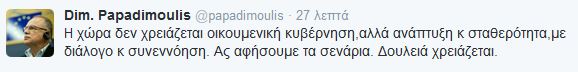 Με μήνυμά του στο Twitter ο κ.Παπαδημούλης αναφέρει: «Η χώρα δεν χρειάζεται οικουμενική κυβέρνηση, αλλά ανάπτυξη και σταθερότητα, με διάλογο και συνεννόηση. Ας αφήσουμε τα σενάρια. Δουλειά χρειάζεται».