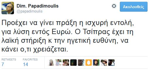 «Προέχει να γίνει πράξη η ισχυρή εντολή, για λύση εντός Ευρώ. Ο Τσίπρας έχει τη λαϊκή στήριξη και την ηγετική ευθύνη, να κάνει ό,τι χρειάζεται».