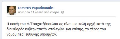 Ο Δημήτρης Παπαδημούλης σχολίασε πριν από λίγο στο Facebook την ποινή που επιβλήθηκε στον Άκη Τσοχατζόπουλο το Τριμελές Εφετείο Κακουργημάτων για την υπόθεση με τις μίζες των εξοπλιστικών προγραμμάτων.