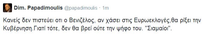 «Κανείς δεν πιστεύει ότι ο Βενιζέλος, αν χάσει στις Ευρωεκλογές, θα ρίξει την Κυβέρνηση. Γιατί τότε, δεν θα βρει ούτε την ψήφο του. “Σιαμαίοι”», έγραψε ο Δημήτρης Παπαδημούλης.