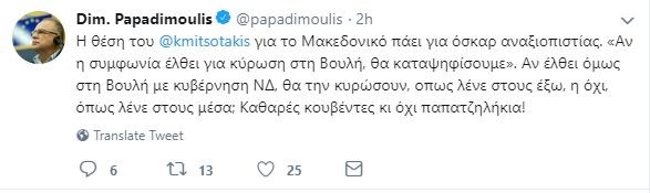 Για «όσκαρ αναξιοπιστίας» πάει η θέση του Κυριάκου Μητσοτάκη για το Μακεδονικό, αναφέρει ο αντιπρόεδρος του Ευρωπαϊκού Κοινοβουλίου, Δημήτρης Παπαδημούλης, σε ανάρτησή του στο Twitter.