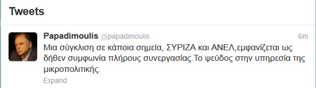 “Μια σύγκλιση σε κάποια σημεία, ΣΥΡΙΖΑ και ΑΝΕΛ, εμφανίζεται ως δήθεν συμφωνία πλήρους συνεργασίας .Το ψεύδος στην υπηρεσία της μικροπολιτικής”, ήταν το σχόλιο του βουλευτή του ΣΥΡΙΖΑ στο twitter.
