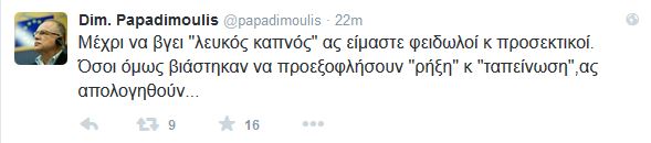 «Μέχρι να βγει “λευκός καπνός” ας είμαστε φειδωλοί κ προσεκτικοί. Όσοι όμως βιάστηκαν να προεξοφλήσουν “ρήξη” και “ταπείνωση”, ας απολογηθούν», αναφέρει ο ευρωβουλευτής του ΣΥΡΙΖΑ και Αντιπρόεδρος του Ευρωπαϊκού Κοινοβουλίου, Δημήτρης Παπαδημούλης, με ανάρτηση του στο Twitter, ασκώντας με αυτό τον τρόπο κριτική σε όσους κατηγορούσαν την κυβέρνηση ότι θα οδηγήσει τη χώρα στην ρήξη.