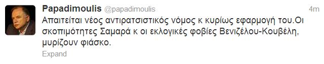«Απαιτείται νέος αντιρατσιστικός νόμος κ κυρίως εφαρμογή του. Οι σκοπιμότητες Σαμαρά κ οι εκλογικές φοβίες Βενιζέλου-Κουβέλη μυρίζουν φιάσκο», σχολίασε χαρακτηριστικά ο βουλευτής του ΣΥΡΙΖΑ, Δημήτρης Παπαδημούλης, μέσω του προσωπικού του λογαριασμού στο twitter.