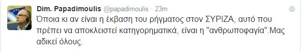 Τις εξελίξεις στο εσωτερικό του ΣΥΡΙΖΑ, σχολίασε ο ευρωβουλευτής, Δημήτρης Παπαδημούλης, με ανάρτηση που έκανε στον προσωπικό του λογαριασμό στο Twitter. Συγκεκριμένα, έγραψε: «Όποια κι αν είναι η έκβαση του ρήγματος στον ΣΥΡΙΖΑ, αυτό που πρέπει να αποκλειστεί κατηγορηματικά, είναι η “ανθρωποφαγία”. Μας αδικεί όλους».