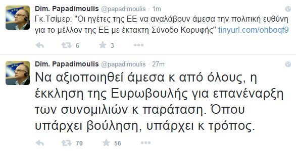 Ο κ. Παπαδημούλης έκανε tweet και τη δήλωση της Προέδρου του κόμματος της Ευρωπαϊκής Αριστεράς στο Ευρωκοινοβούλιο, Γκάμπι Τσίμερ: «Οι ηγέτες της ΕΕ να αναλάβουν άμεσα την πολιτική ευθύνη για το μέλλον της ΕΕ με έκτακτη Σύνοδο Κορυφής».