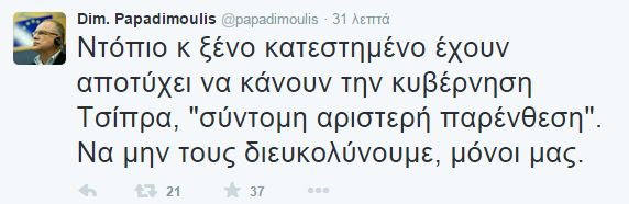 «Ντόπιο και ξένο κατεστημένο έχουν αποτύχει να κάνουν την κυβέρνηση Τσίπρα, “σύντομη αριστερή παρένθεση”. Να μην τους διευκολύνουμε, μόνοι μας», έγραψε ο Ευρωβουλευτής του ΣΥΡΙΖΑ και Αντιπρόεδρος του Ευρωπαϊκού Κοινοβουλίου, Δημήτρης Παπαδημούλης, σχολιάζοντας τις πολιτικές εξελίξεις στη χώρα.