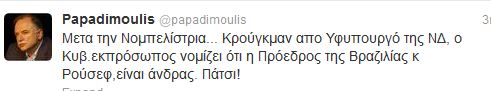 “Μετα την Νομπελίστρια… Κρούγκμαν απο Υφυπουργό της ΝΔ, ο Κυβ.εκπρόσωπος νομίζει ότι η Πρόεδρος της Βραζιλίας κ Ρούσεφ,είναι άνδρας. Πάτσι!”, ήταν το σχόλιο του κοινοβουλευτικού εκπροσώπου του ΣΥΡΙΖΑ.
