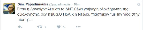 Την απάντηση της Κριστίν Λαγκάρντ στον Αλέξη Τσίπρα, με αφορμή τις διαρροές, μέσω Wikileaks, σχολίασε ο ευρωβουλευτής του ΣΥΡΙΖΑ και αντιπρόεδρος του ευρωπαϊκού κοινοβουλίου, Δημήτρης Παπαδημούλης, με ανάρτηση στο Twitter, επισημαίνοντας ότι η γενική διευθύντρια του ΔΝΤ “δεν πείθει”, ενώ προσθέτει ότι “ο Τόμσεν και η Ντέλια πιάστηκαν με την γίδα στην πλάτη”