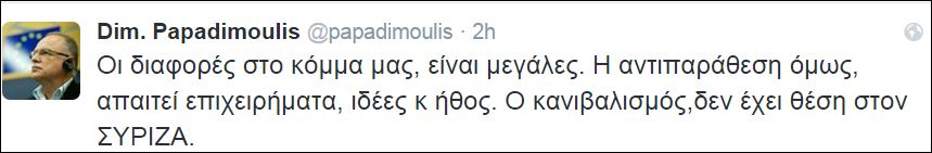 «Οι διαφορές στο κόμμα μας είναι μεγάλες» έγραψε στον προσωπικό του λογαριασμό στο twitter ο ευρωβουλευτή του ΣΥΡΙΖΑ, Δημήτρης Παπαδημούλης, σημειώνοντας ότι στον ΣΥΡΙΖΑ «δεν έχει θέση ο κανιβαλισμός».