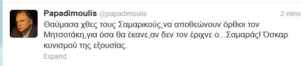 “Θαύμασα χθες τους Σαμαρικούς να αποθεώνουν όρθιοι τον Μητσοτάκη”, σχολιάζει στο twitter ο Δημήτρης Παπαδημούλης…