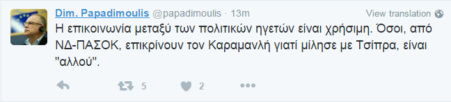 Συγκεκριμένα, ο κ. Παπαδημούλης έγραψε: «Η επικοινωνία μεταξύ των πολιτικών ηγετών είναι χρήσιμη. Όσοι, από ΝΔ-ΠΑΣΟΚ, επικρίνουν τον Καραμανλή γιατί μίλησε με τον Τσίπρα, είναι “αλλού”».
