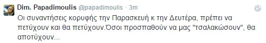 “Οι συναντήσεις Κορυφής την Παρασκευή και την Δευτέρα, πρέπει να πετύχουν και θα πετύχουν. Όσοι προσπαθούν να μας ‘τσαλακώσουν’, θα αποτύχουν…” έγραψε στο λογαριασμό του στο twitter ο ευρωβουλευτής του ΣΥΡΙΖΑ και αντιπρόεδρος του Ευρωπαϊκού Κοινοβουλίου, Δημήτρης Παπαδημούλης.