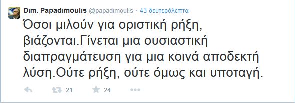 Τις εξελίξεις μετά τη συνεδρίαση του Eurogroup σχολίασε ο αντιπρόεδρος του Ευρωπαϊκού Κοινοβουλίου και ευρωβουλευτής του ΣΥΡΙΖΑ, Δημήτρης Παπαδημούλης, μέσω του προσωπικού του λογαριασμού στο Twitter. Αναλυτικά ο κ. Παπαδημούλης έγραψε: «Όσοι μιλούν για οριστική ρήξη, βιάζονται. Γίνεται μια ουσιαστική διαπραγμάτευση για μια κοινά αποδεκτή λύση. Ούτε ρήξη, ούτε όμως και υποταγή».
