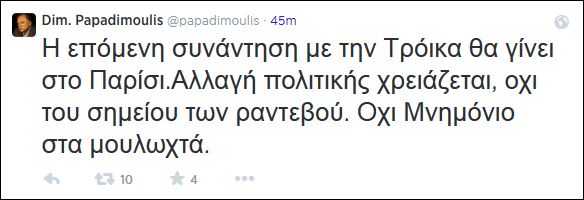 «Η επόμενη συνάντηση με την Τρόικα θα γίνει στο Παρίσι.Αλλαγή πολιτικής χρειάζεται, οχι του σημείου των ραντεβού. Οχι Μνημόνιο στα μουλωχτά», αναφέρει το «τιτίβισμα» του κ. Παπαδημούλη.