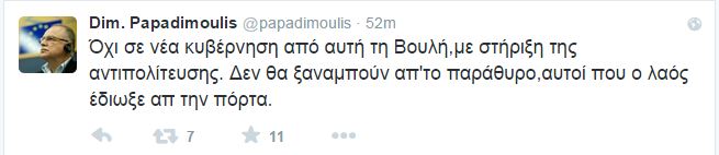 «Όχι σε νέα κυβέρνηση από αυτή τη Βουλή, με στήριξη της αντιπολίτευσης. Δεν θα ξαναμπούν απ’ το παράθυρο, αυτοί που ο λαός έδιωξε απ την πόρτα», έγραψε χαρακτηριστικά ο κ. Παπαδημούλης στο twitter.