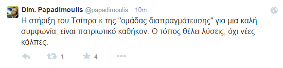 Η στήριξη του Τσίπρα και της “ομάδας διαπραγμάτευσης” για μια καλή συμφωνία, είναι πατριωτικό καθήκον. Ο τόπος θέλει λύσεις, όχι νέες κάλπες.”, ανέφερε χαρακτηριστικά στον προσωπικό του λογαριασμό στο twitter, ο αντιπρόεδρος του Ευρωπαϊκού κοινοβουλίου, Δημήτρης Παπαδημούλης.