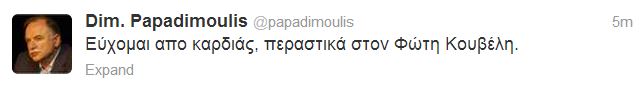 Μετά την αποκάλυψη του enikos.gr για την αδιαθεσία που αισθάνθηκε ο κ. Κουβέλης, ο Δ. Παπαδημούλης έγραψε χαρακτηριστικά στον προσωπικό του λογαριασμό στο twitter: