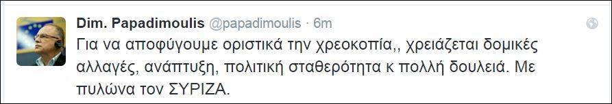 «Για να αποφύγουμε οριστικά την χρεοκοπία, χρειάζεται δομικές αλλαγές, ανάπτυξη, πολιτική σταθερότητα και πολλή δουλειά» γράφει ο Δημήτρης Παπαδημούλης, στον προσωπικό του λογαριασμό στο twitter και προσθέτει: