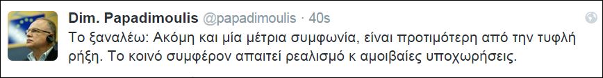 Την εκτίμηση ότι «μία μέτρια συμφωνία είναι προτιμότερη από την τυφλή ρήξη» εξέφρασε ο ευρωβουλευτής του ΣΥΡΙΖΑ, Δημήτρης Παπαδημούλης, μέσω twitter.