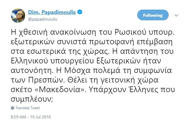 “Η Μόσχα πολεμά τη συμφωνία των Πρεσπών. Θέλει τη γειτονική χώρα σκέτο «Μακεδονία». Υπάρχουν Έλληνες που συμπλέουν;”διερωτάται ο αντιπρόεδρος του Ευρωπαϊκού Κοινοβουλίου.