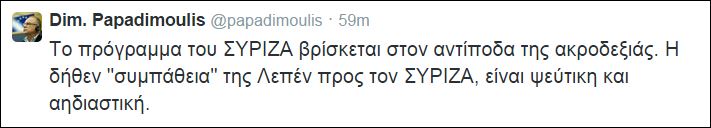 «Το πρόγραμμα του ΣΥΡΙΖΑ βρίσκεται στον αντίποδα της ακροδεξιάς. Η δήθεν “συμπάθεια” της Λεπέν προς τον ΣΥΡΙΖΑ, είναι ψεύτικη και αηδιαστική», έγραψε ο Δημήτρης Παπαδημούλης στο twitter.