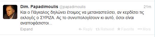 Με ιδιαίτερα καυστικό τρόπο σχολιάζει ο Δημήτρης Παπαδημούλης την τοποθέτηση του Θεόδωρου Πάγκαλου για τις επιλογές του πρώην υπουργού σε περίπτωση που ο ΣΥΡΙΖΑ σχηματίσει κυβέρνηση. Ο κοινοβουλευτικός εκπρόσωπος του ΣΥΡΙΖΑ, με ανάρτηση στον προσωπικό του λογαριασμό στο twitter, προτρέπει τους αναποφάσιστους ψηφοφόρους να ψηφίσουν το κόμμα του με την προοπτική να εγκαταλείψει ο κ. Πάγκαλος την χώρα.