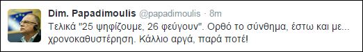 “Τελικά “25 ψηφίζουμε, 26 φεύγουν”. Ορθό το σύνθημα, έστω και με… χρονοκαθυστέρηση. Κάλλιο αργά, παρά ποτέ!” έγραψε στο λογαριασμό του στο Twitter ο αντιπρόεδρος του Ευρωπαϊκού Κοινοβουλίου και ευρωβουλευτής του ΣΥΡΙΖΑ, Δημήτρης Παπαδημούλης.