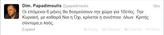 Το tweet του κ. Παπαδημούλη: “Οι επόμενοι 6 μήνες θα δεσμεύσουν την χώρα για 10ετίες. Την Κυριακή, με καθαρά Ναι η Όχι, κρίνεται η συνέπεια όλων. Κριτής σύντομα,ο λαός”.