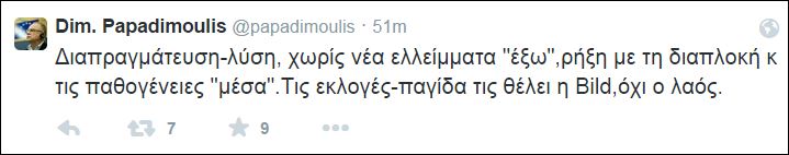 “Διαπραγμάτευση-λύση, χωρίς νέα ελλείμματα “έξω”, ρήξη με τη διαπλοκή και τις παθογένειες “μέσα”.Τις εκλογές-παγίδα τις θέλει η Bild,όχι ο λαός.”, έγραψε στον προσωπικό του λογαριασμό στο twitter, o Δημήτρης Παπαδημούλης.