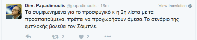 «Τα συμφωνημένα για το προσφυγικό και η δεύτερη λίστα με τα προαπαιτούμενα, πρέπει να προχωρήσουν άμεσα. Το σενάριο της εμπλοκής βολεύει τον Σόιμπλε», αναφέρει σε ανάρτηση στο twitter ο αντιπρόεδρος του ευρωπαϊκού κοινοβουλίου και ευρωβουλευτής του ΣΥΡΙΖΑ, Δημήτρης Παπαδημούλης.