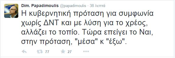 Ο ευρωβουλευτής του ΣΥΡΙΖΑ, Δημήτρης Παπαδημούλης σχολίασε μέσω twitter: «η νέα κυβερνητική πρόταση για συμφωνία χωρίς ΔΝΤ και με λύση για το χρέος, αλλάζει το τοπίο. Tώρα επείγει το «ναι» στην πρόταση, “μέσα” και “έξω”».