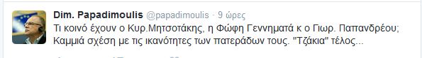 «Τι κοινό έχουν ο Κυριάκος Μητσοτάκης, η Φώφη Γεννηματά και ο Γιώργος Παπανδρέου; Καμιά σχέση με τις ικανότητες των πατεράδων τους. “Τζάκια” τέλος…», αναφέρει στο tweet του ο κ.Παπαδημούλης.