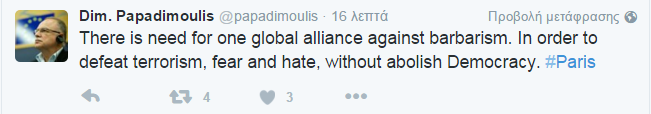 Τις τρομοκρατικές επιθέσεις που σημειώθηκαν το βράδυ της Παρασκευής στο Παρίσι, σχολίασε ο ευρωβουλευτής Δημήτρης Παπαδημούλης με ανάρτηση του στο Twitter.