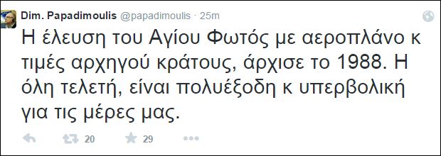 “Η έλευση του Αγίου Φωτός με αεροπλάνο και τιμές αρχηγού κράτους, άρχισε το 1988. Η όλη τελετή, είναι πολυέξοδη και υπερβολική για τις μέρες μας” έγραψε στο Twitter ο ευρωβουλευτής του ΣΥΡΙΖΑ και Αντιπρόεδρος του Ευρωπαϊκού Κοινοβουλίου.