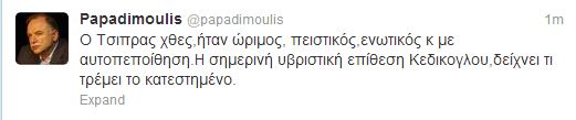 “Ώριμος, πειστικός, ενωτικός και με αυτοπεποίθηση ο Τσίπρας”, twittάρει ο Δημήτρης Παπαδημούλης κι επιτίθεται στον Κεδίκογλου.
