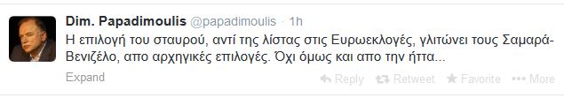 “Η επιλογή του σταυρού, αντί της λίστας στις Ευρωεκλογές, γλιτώνει τους Σαμαρά-Βενιζέλο, απο αρχηγικές επιλογές. Όχι όμως και απο την ήττα…” έγραψε στο Twitter ο κοινοβουλευτικός εκπρόσωπος του ΣΥΡΙΖΑ σχολιάζοντας το ενδεχόμενο εκλογής των ευρωβουλευτών με σταυρό, θέμα που συζητήθηκε στη σύσκεψη που έγινε το Σάββατο στο Μέγαρο Μαξίμου.