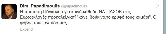 Την πρόταση του Θεόδωρου Πάγκαλου να κατέβουν μαζί ΝΔ και ΠΑΣΟΚ στις ευρωεκλογές σχολίασε μέσω Twitter o κοινοβουλευτικός εκπρόσωπος του ΣΥΡΙΖΑ Δημήτρης Παπαδημούλης.