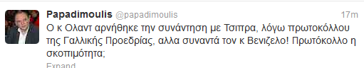 Την αντίδραση του ΣΥ.ΡΙΖ.Α. προκάλεσε η συνάντηση του πρόεδρο του ΠΑΣΟΚ Ευάγγελου Βενιζέλου με προέδρο της Γαλλίας Φρανσουά Ολάντ, ο οποίος είχε αρνηθεί να συναντηθεί με τον Αλέξη Τσίπρα. Ο βουλευτής του κόμματος Δημήτρης Παπαδημούλης αναρωτήθηκε μέσω Twitter : “O κ. Ολάντ αρνήθηκε την συνάντηση με Τσίπρα, λόγω πρωτοκόλλου της Γαλλικής προεδρίας, αλλά συναντά τον κ. Βενιζέλο. Πρωτόκολλο ή σκοπιμότητα”; Ενώ, στη συνέχεια έγραψε, μεταξύ άλλων: “Τα δύο μέτρα και σταθμά του κ. Ολάντ σε Τσίπρα-Βενιζέλο είναι λάθος”.