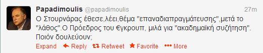 «Ο Στουρνάρας έθεσε, λέει, θέμα “επαναδιαπραγμάτευσης”, μετά το “λάθος”. Ο πρόεδρος του eurogroup μιλά για “ακαδημαϊκή συζήτηση”. Ποιόν δουλεύουν;» έγραψε στο twitter o κ. Παπαδημούλης.